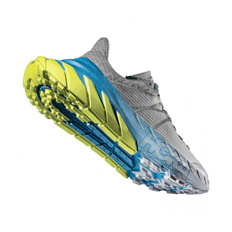 La plataforma alargada de un tamaño excepcional te garantiza pisadas seguras y te aportarán una gran estabilidad durante tus recorridos. Esta zapatilla de trail running de Hoka One One cuenta con un upper de mesh que favorece la circulación del aire y te proporciona una gran transpirabilidad. La lengüeta de Ariaprene te aporta confort y una sensación de frescor. La suela de este modelo dispone de tacos en la zona del antepié para una mayor durabilidad y agarre en todos los terrenos.